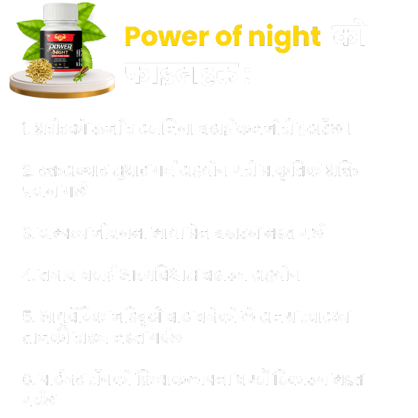 Power of Night एक आयुर्वेदिक सप्लिमेन्ट हो, जसले दाम्पत्य जीवनमा शक्ति, स्टामिना र आत्मविश्वास बढाउन मद्दत गर्छ। यसले शरीरभित्रको रक्तसञ्चार सुधार गरी दीर्घकालीन ऊर्जा प्रदान गर्छ।